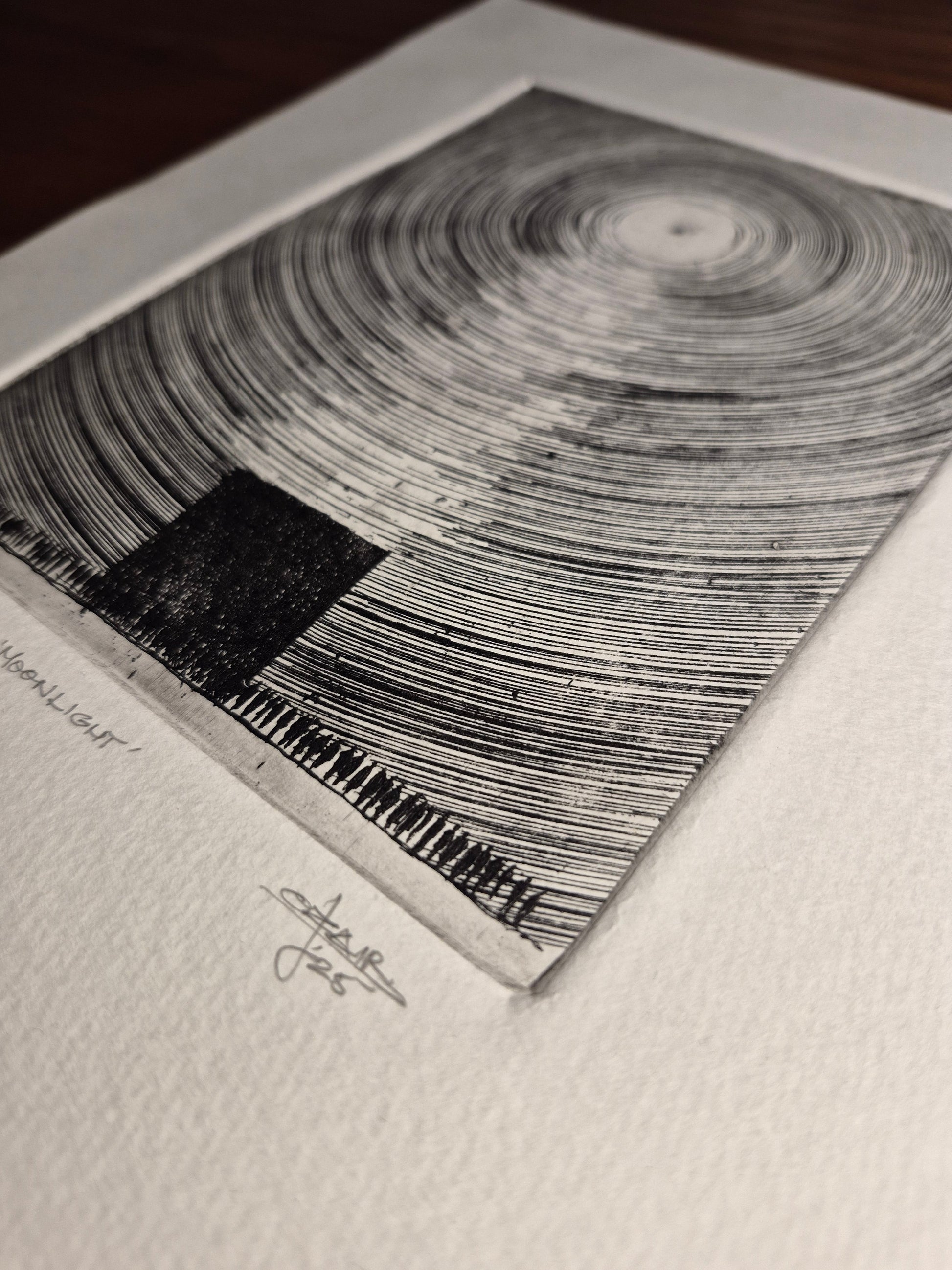 Zinc plate intaglio etching on Canson 300 gsm cold-pressed archival paper.